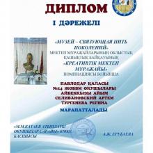 Во Дворце школьников им. М.М.Катаева завершился областной дистанционный конкурс школьных музеев «Музей – связующая нить поколений». Конкурс проходил по трем номинациям: «Лучший музейный видеоэкскурсовод»; «Креативный школьный музей»; «Герои родного края». В состав жюри вошли Крупа Татьяна Николаевна, заведующая Международной научно-исследовательской лабораторией «YMAI» MargulanCentre Павлодарского педагогического университета, Ефимова Ирина Александровна, заведующая отделом «Краеведения» КГКП ДЮЦЭТ, Вервекин Александр Анатольевич, директор ОО «Павлодарский Дом географии». В представленных видеороликах члены жюри оценивали деятельность музеев по отражению важнейших событий региона в истории Казахстана и оформление новых экспозиций. В номинации «Лучший музейный видеоэкскурсовод»: В номинации «Креативный школьный музей»: В номинации «Герои родного края»: